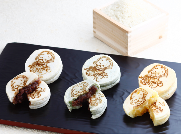 我社オリジナル商品の米小判。安来産米粉を使用した、もっちりとして、ボリューム満点の白い大判焼です。種類はつぶあん、カスタード、よもぎ(中身はこしあん)、黒ゴマです。 冬季限定で、黒ゴマがゆずあんにかわります。